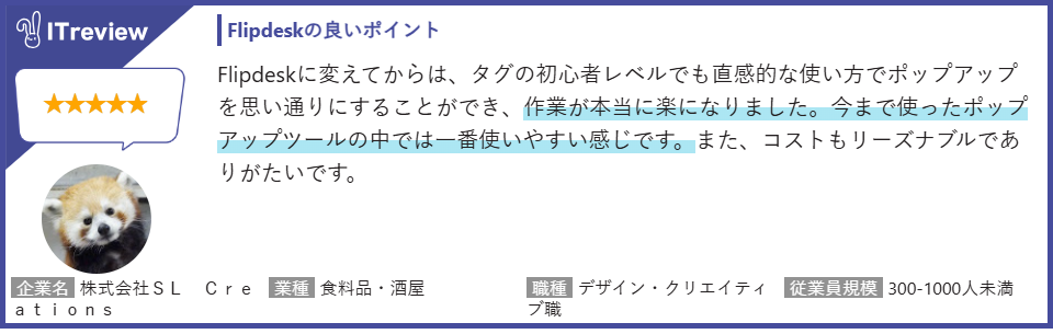 ご利用企業様からいただくレビューでは、サポートが手厚い点や、機能自体も常に改善されている点を高く評価いただいております。